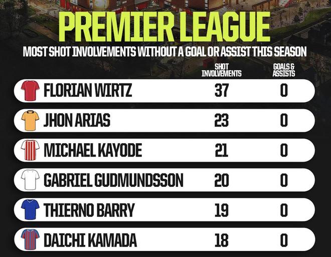 据统计,维尔茨一共参与了37次射门,是本赛季英超0球0助的球员中最多的。